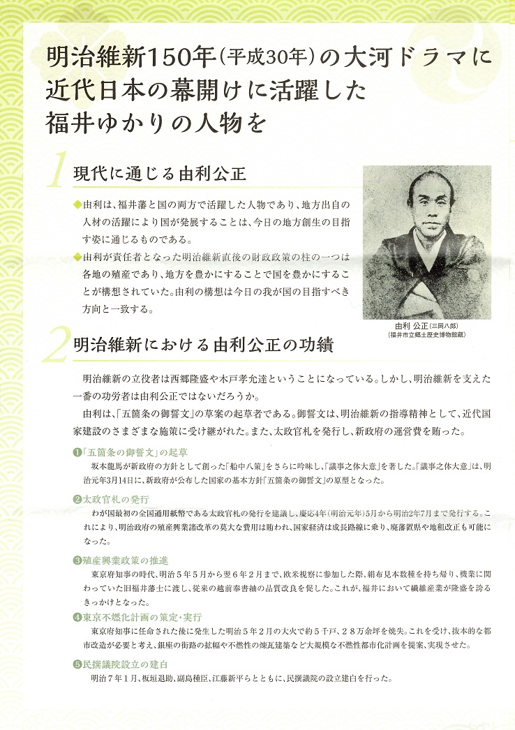 さてドラマ誘致については、福井藩の財政を立て直した実績により明治新政府の財政担当に抜擢され、五箇条の御誓文の起草や太政官札の発行、銀座の街作り等にも功績があった「由利公正(ゆりきみまさ)」を主人公候補に、その時代の県内の偉人達が活躍する福井を舞台とするドラマを目指しており、県民とともに、誘致活動に取り組むとして、昨年11月13日「福井県大河ドラマ誘致推進協議会」を結成し、11月17日(火)NHKへの要望活動を開始した。